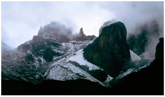 Across the world, Indigenous cosmologies view mountains or massifs as sacred. In the Andes of South America, for instance, the Indigenous peoples regard the high peaks as living deities or powerful spirits [37]. For the native populations of the Andes, “the mountains are sacred places and central elements of a mythical historical identity” because, in Inca origin legends, the founding ancestors emerged from the land itself [37]. Mountains are understood as the dwelling places of the dead and a host of spirits. Inside the mines of the Andean mountains, miners honor an ambivalent spirit called El Tío, who resides in the dark caverns and must be appeased with offerings [37]. This illustrates how summits and the interior “wombs” of mountains figure in spiritual life. Taking an example from another continent, Mount Kenya is revered among the Kikuyu as God’s home on earth (Figure 2). Kikuyu communities face the mountain when praying, regarding it as a sacred direction [38]—this example also shows how a geological landscape is integrated not only in origin accounts but also in religious or spiritual rituals.