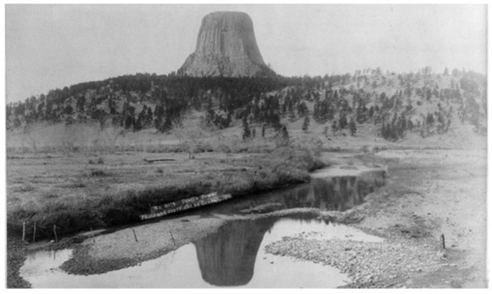 Historical photo of Devils Tower. The rock formation is widely regarded by Indigenous peoples as a sacred site of creation. Source: National Park Service [43].