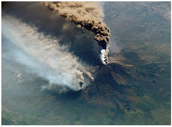 Mount Etna erupted on 27 October 2002, triggered by a series of earthquakes. The ancient Romans interpreted the periodic eruptions as the smithing activity of the god of fire. Source: NASA Public Domain.