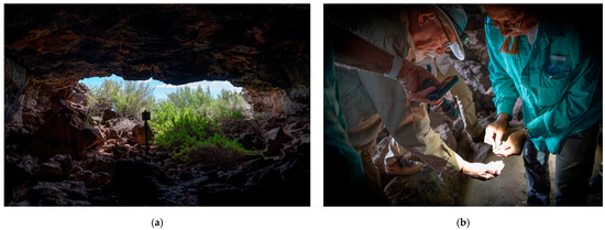 The ritual significance of the volcanic landscapes is underscored by the shrines and offerings left at various sites identified by the tribal representatives in the ethnographic study. The Zuni representatives viewed volcanic eruptions as a powerful activity of Mother Earth, causing both rebirth and destruction. While volcanic sites are recognized as spiritual places for seeking knowledge and power [49], the eruptions were also seen as destructive. The Zuni representatives explained that red hematite, pottery sherds, and other offerings were placed in the lava-tube shelter caves (Figure 6)“so that we will not go through the devastation of eruptions again.” These types of world-upholding ceremonies are still conducted today, with Zuni people continuing their pilgrimage for offerings, asking the fiery forces (Adani) to stay and not come to the surface. Scholars such as Ruth Van Dyke [54] have argued that participating in ceremonies at these geologically defined center places was seen as necessary to maintain cosmic order—to keep their lives—and the world—in balance.