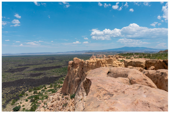Although often connected to destruction in origin accounts, volcanoes are also related to rebirth and creation. In the American Southwest, many Pueblo groups regard the lava tubes or other caverns as entrances to the Sipapu (Shipap to the Acoma)—the place of emergence where their ancestors climbed from the underworld to the surface [13]. Volcanic eruptions and, by extension, volcanic geological features are often connected to creation, as the eruption quite literally produces new land masses. In Hawaii, volcanic eruptions are traditionally understood as the rebirth of the earth [13]; they are understood as a creative force that can cause new land to be formed through lava flows that harden into rock [45]. Likewise, the lava flows of El Malpais (Figure 5) have been connected to fertility in Acoma lore [48]. Stoffle and Van Vlack argue that “Native American people residing in the western U.S. share an understanding of volcanoes as places where the earth is reborn and eruptions are the active process of rebirth” [49] (p. 3). Furthermore, “the Native groups recognize the volcanic activity of Sunset Crater as involving lessons of rebirth that are necessary for human survival” [49] (p. 12).
