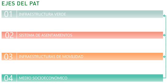 Competency axes and/or analysis–diagnosis axes of the three analyzed PATs: 01, green infrastructure; 02, settlement system; 03, infrastructures of mobility; 04, socioeconomic system. Source: own elaboration.