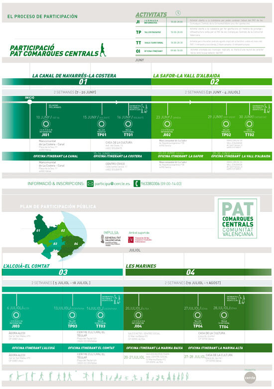 A set of activities developed for the four county groups during the drafting of the initial version of the Territorial Action Plan for the Central Valencian Counties (PATCCV). The activity schedule sequentially covers the entire territorial scope of the plan. Source: own elaboration.