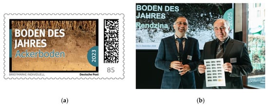 Since the introduction of the ‘Soil of the Year’ initiative, a special stamp has been issued annually to highlight the respective soil of the year (Figure 3). This project was initiated by the soil scientist Prof. Dr. Hans-Peter Blume [14]. Initially, the stamps were printed in Austria and Liechtenstein; since 2017, production has been handled by Deutsche Post. Approximately 1500 stamps are produced each year. They are widely used as promotional materials in business correspondence by soil scientists, companies, organisations and offices.