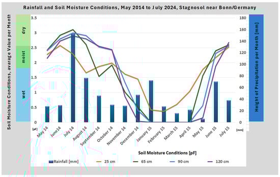 Rainfall and soil moisture conditions, May 2014 to July 2015, Stagnosol (Soil of the year 2015) near Bonn, Germany. [Data: Gerhard Milbert].