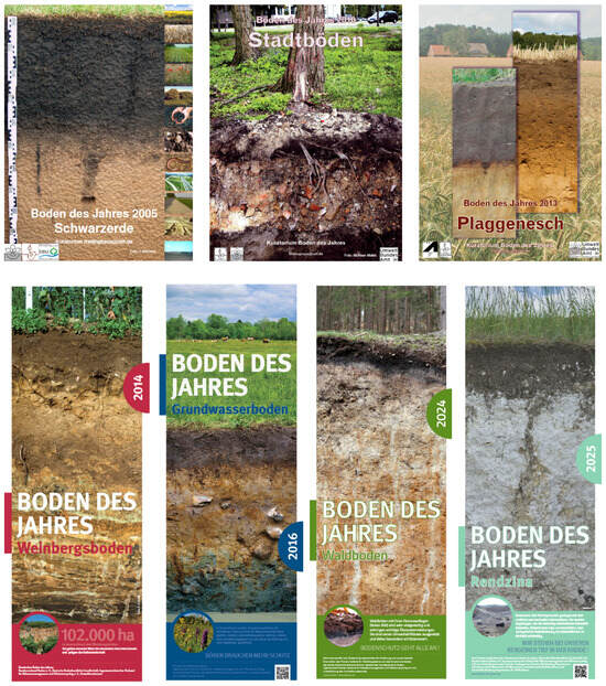 - Frielinghaus, M.; Milbert, G. Aktion Boden des Jahres—Ein Beitrag zur bewussten Wahrnehmung von Böden in der Gesellschaft. In Böden Deutschlands, Österreichs und der Schweiz; Joisten, H., Giani, L., Kocha, N., Kühn, D., Sauer, D., Schad, P., Sponagel, H., Eds.; Springer Spektrum: Berlin/Heidelberg, Germany, 2024; pp. 49–54. [Google Scholar] [CrossRef]