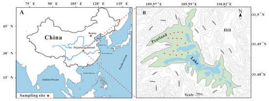 The DJH peatland is situated in a subalpine mountain basin (31°28′50″ N, 110°00′09″ E) within the Shennongjia region of Hubei Province in central China. This region lies at the ecotone between the subtropical and warm temperate zones and is characterized by a monsoon-influenced climate [11]. The peatland ranges in elevation from 1700 m to 1760 m above sea level, covers a total area of 16 km2, and has an average annual temperature of 7.4 °C. Vegetation is predominantly composed of Carex spp., Sanguisorba officinalis, Juncus spp., Gentiana pseudo-aquatica, and Sphagnum spp. [11].