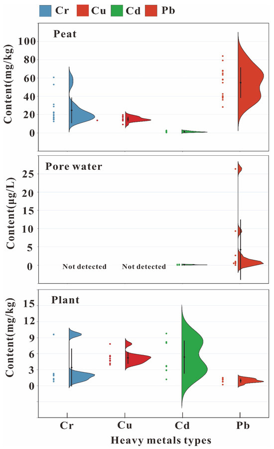 The descriptive statistics for metal parameters in peat, pore water, and moss are presented in Figure 2. The mean concentrations of Cr, Cu, Cd, and Pb in peat samples were 24.6 ± 13.7 mg/kg, 14.9 ± 2.51 mg/kg, 1.15 ± 0.62 mg/kg, and 54.9 ± 16.16 mg/kg, which were higher than those in the soil of Shennongjia (Cu: 13.53 mg/kg, Pb: 9.89 mg/kg, Cd: 0.49 mg/kg), except Cr (32.39 mg/kg) [36]. The concentrations of Cr, Cu, and Pb were below the risk screening thresholds specified in the Chinese Soil Environmental Quality Risk Control Standard (GB15618-2018) [37]. In contrast, the Cd concentration in peat exceeded the threshold outlined in the same standard [37]. The compensation coefficients of heavy metals in the peat of Dajiuhu are as follows: Cr (2.39), Cu (1.42), Cd (2.35), and Pb (1.73). These results indicated that the Dajiuhu peatland has undergone significant enrichment and accumulation processes relative to the surrounding soil. The high coefficients of variation (CVs) for Cr (56%), Cu (17%), Cd (54%), and Pb (29%) suggest significant spatial heterogeneity in their distributions. Similarly, the average values of water level (2.92 ± 7.95 cm), ORP (3.99 ± 1.90 mV), SAL (0.04 ± 0.02 ppt), and EC (3.99 ± 1.90 μS/cm) exhibited substantial variability across sampling points, with CVs of 272% (water level), 48% (ORP), 50% (SAL), and 42% (EC). Notably, the pH values (4.52 ± 0.34) at various points in the wetland were slightly acidic, with minimal variability (CV: 7.7%). Despite no statistically significant correlation being observed between heavy metal content and changes in water level, ORP, SAL, pH, or EC (based on the results of the correlation analysis, p > 0.05), these factors may collectively influence the geochemical behavior of heavy metals in wetlands. Previous studies in the DJH region have shown that variations in water levels driven by peatland topography significantly affect the distribution of Hg in peatlands [38]. Furthermore, the percentage differences in C (56 ± 11%) and N (3.7 ± 0.59%) contents at each point were not significant, indicating that C and N inputs from plant sources are distributed relatively uniformly throughout the peatland. This uniformity suggests that humus, which is closely associated with plant input, may play a buffering role in stabilizing pH levels in peatland.