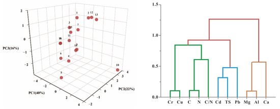 Principal component analysis (PCA) and cluster analysis (CA) of heavy metals and geochemical factors.