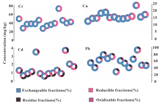 The content of heavy metals (mg/kg) and the distribution of heavy metals speciation (exchangeable fractions, reducible fractions, residue fractions, and oxidizable fractions) at each sampling site.
