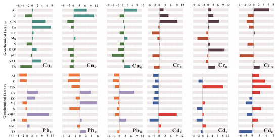 Cr exhibits geochemical behaviors similar to those of Cu. The exchangeable Cr fraction correlates positively with C/N and C content but is less responsive to Ca and SAL. Reducible Cr is significantly modulated by redox potential (ORP), showing greater redox variation (trivalent to pentavalent) than Cu [26]. Pentavalent Cr forms CrO42− under high ORP, where Fe and Mn oxides enhance Cr coating and increase its reducible fraction [66]. The oxidizable Cr fraction correlates positively with Al content but negatively with pH, consistent with Cu migration and transformation patterns.