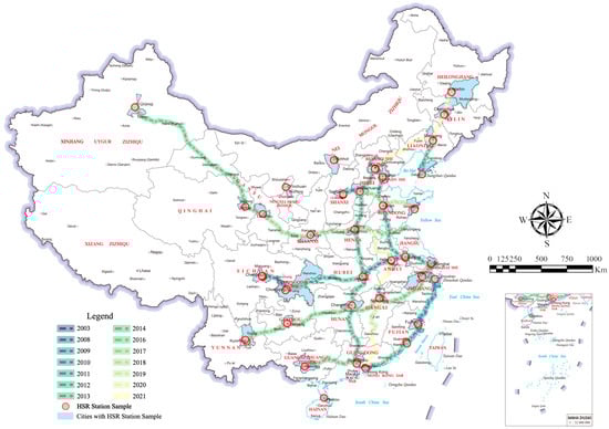 In recent decades, the rapid expansion of high-speed rail (HSR) networks has become a transformative force reshaping the spatial organization of cities and regions [1,2]. As an efficient, high-capacity mode of intercity transport, HSR enhances regional connectivity, compresses travel time, and drives urban integration and spatial restructuring across scales [3,4,5]. In China, the development of the world’s largest HSR system has not only fulfilled key transportation demands but has also profoundly impacted urban form, land use patterns, and population distribution [6,7,8].