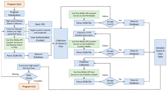 Notably, Sina Weibo initially provided an open API for check-in data access in 2012 [50,51,52]. However, the original interface was later discontinued due to overwhelming access traffic. In response to this limitation, this study improved upon previous methods by developing a targeted data acquisition strategy. Specifically, we conducted a detailed search of the Sina Weibo source pages, applied precise filtering techniques, and utilized both the location service API and user service API in an integrated manner. This optimized workflow significantly enhanced both the accuracy and efficiency of data collection, thereby laying a solid foundation for subsequent analysis.
