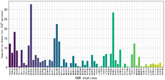 From the cumulative check-in bar chart, it is evident that human activity in HSR station areas exhibits a significant spatial clustering pattern, particularly concentrated in economically developed metropolitan regions (Figure 4). For instance, Shanghai Hongqiao Station, Futian Station, Beijing Station, and Shenzhen Station rank among the top nationwide in terms of cumulative check-ins, reaching 327,000, 224,000, 183,000, and 151,000 check-ins, respectively. Notably, Shanghai Hongqiao Station recorded the highest number of check-ins, highlighting its strong attractiveness as a core transportation hub.