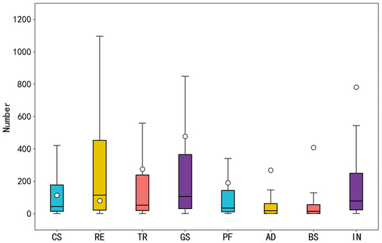 Number of check-ins in different types of spaces around high-speed rail stations. Note: For clarity and brevity, space types are represented using abbreviations: GS stands for Green Space, CS for Commercial Services, PF for Public Facilities, TR for Transportation, RE for Residential, AD for Administrative, BS for Business, and IN for Industrial. These abbreviations correspond to major urban functional zones.