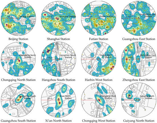 According to the spatial distribution of check-in data, the activity patterns of populations in HSR station areas can be generally categorized into three types: balanced distribution, fan-shaped clustering, and star-shaped dispersion (Figure 6). First, stations with a balanced distribution are typically located near city centers. These areas tend to develop evenly, with commercial and business functions highly concentrated, which generates strong attractiveness and leads to relatively uniform population aggregation. Typical examples include Beijing Station, Tianjin Station, Shanghai Station, Futian Station, Guangzhou East Station, Chengdu South Station, and Zhengzhou Station. These stations represent the typical development pattern of central urban HSR stations.