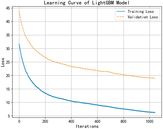 Based on the hyperparameter tuning results, a scatterplot matrix was used to visualize the interactions between parameters and their impact on model performance (Figure 8). The selected optimal parameter configuration achieved a well-balanced trade-off between model fitting and generalization. Specifically, the learning rate was set to 0.01 to ensure stable optimization and reduce the risk of overfitting. The number of trees was set to 1041 to improve accuracy without introducing excessive computational burden. The maximum tree depth was limited to 10, effectively controlling model complexity and enhancing generalization capability. Each tree was allowed a maximum of 15 leaf nodes, increasing fitting capacity while mitigating overfitting. The subsample ratio was set at 0.648, helping introduce randomness and reduce overfitting. Additionally, the feature subset ratio was set to 0.624, which further enhanced model diversity. Lastly, the minimum number of samples per leaf was set to 10, ensuring node stability and robust decision splits. Collectively, these hyperparameter settings enabled the model to achieve strong and stable performance in predicting active population clustering. The LightGBM model achieved an R-squared value of 0.7347, a Root Mean Squared Error (RMSE) of 3.3273, and a Mean Absolute Error (MAE) of 1.9621. Figure 9. Learning curve of the LightGBM model showing the loss trajectories for both the training and validation sets. As the number of iterations increases, both losses decrease and gradually stabilize, with no upward trend in validation loss—indicating good model convergence and no significant overfitting.