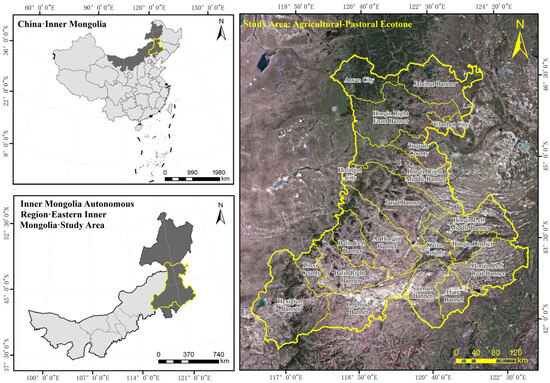 Eastern Inner Mongolia Autonomous Region, herein referred to as eastern Inner Mongolia, is situated within the agro-pastoral ecotone of Northern China. Geographically, eastern Inner Mongolia lies between 115°21′–126°04′ E and 41°17′–53°20′ N, with an approximate east–west span of 750 km and a north–south extent of 1330 km. It covers a total land area of approximately 452,300 km2, accounting for 39.1% of Inner Mongolia’s total area. Administratively, eastern Inner Mongolia comprises four prefecture-level jurisdictions: Hulunbuir, Hinggan League, Tongliao, and Chifeng [18].