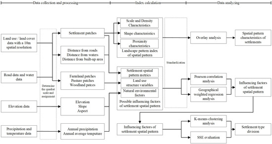 In this study, a structured three-stage research framework is adopted to investigate the spatial patterns and underlying drivers of rural settlements in the agro-pastoral ecotone of eastern Inner Mongolia. As depicted in Figure 2, at stage 1, considering the characteristics of the agro-pastoral ecotone in eastern Inner Mongolia, we collected two categories of baseline data: natural environmental variables and socioeconomic indicators (Table 1). These data were processed using ArcGIS 10.8 to derive spatial variables, such as patch area, density, and proximity, along with elevation, slope, aspect, farmland area, forest area, pasture area, mean annual temperature, distance to roads, and distance to rivers. These variables were then categorized according to their relevance to settlement formation. At stage 2, grid cell sizes were determined based on previous studies and data resolution. All variables were spatially aggregated and assigned to the corresponding grid cells. The final stage encompassed a suite of spatial analytical techniques: (1) Using FRAGSTATS 4.2, a set of landscape pattern indices, including PD, MPS, LSI, SPLIT, and MNN, were computed. These metrics were visualized and interpreted in ArcGIS 10.8 to determine spatial pattern characteristics and distribution factors. (2) Pearson’s correlation analysis and GWR analysis were conducted to screen and verify three categories of factors potentially influencing settlement spatial patterns. (3) IBM SPSS Statistics 27 was used to process influence factors within each grid cell, serving as the basis for classifying settlement types via K-means clustering. The SSE criterion was applied as a validation metric.