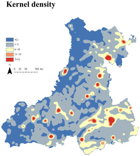 To capture the spatial distribution and clustering intensity of rural settlements, kernel density estimation was utilized (Figure 3). Based on established classification standards and regional characteristics [18], settlements were categorized into five density levels. The results indicate that high-density settlement clusters are predominantly concentrated in the southeastern section of the Liaohe Plain. Additionally, a continuous belt of moderately high-density settlements extends along the eastern foothills of the Greater Khingan Mountains, forming a linear axis from the central region to the northeast. Areas of moderate density are primarily distributed around high-density zones, particularly in the southeastern portion of the study area, forming relatively contiguous settlement belts. In contrast, the northwestern and southwestern margins are characterized by dispersed and low-density settlement patterns, with only isolated instances of clustering.