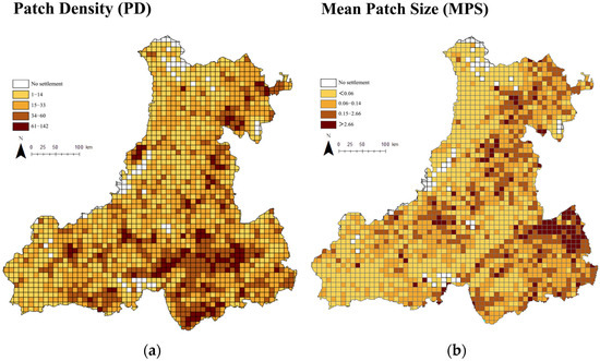 Spatial distribution of settlement scale and density characteristics. (a) Patch Density (PD). (b) Mean Patch Size (MPS).