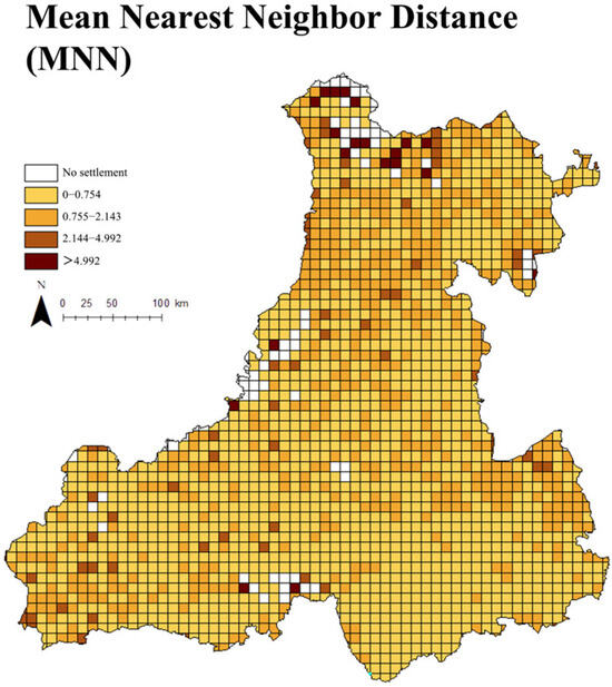 As illustrated in Figure 6, the spatial distribution of the MNN reveals clear variation across the region. The majority of settlement patches are separated by distances of less than 2.1 km, with a regional MNN of 0.83 km. This relatively short inter-patch distance aligns with the general pattern of small, scattered rural settlements in Inner Mongolia’s low-density areas. Larger inter-patch distances are predominantly found in the northern portions of the study area. Grid cells exhibiting MNN values exceeding 5 km are mainly located along the northern and southern edges of the region. In certain cases, the maximum inter-patch distances exceed 12 km.