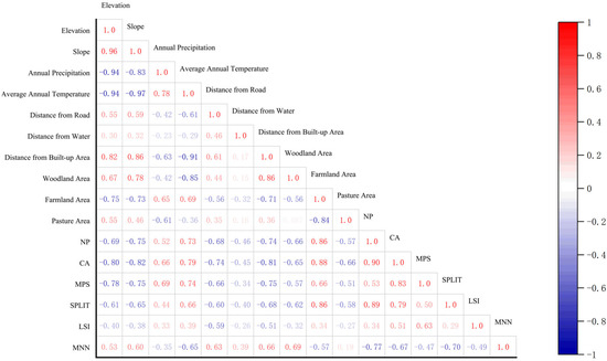 The correlation matrix (Figure 7) reveals several notable intra- and inter-category relationships. For instance, elevation shows a significant positive correlation with slope, indicating substantial topographical variation in the Inner Mongolia agro-pastoral zone—higher elevations are typically associated with steeper terrain. Additionally, farmland areas exhibit a strong negative correlation with pasture areas, suggesting a spatial trade-off between farmland expansion and grazing land. Within the settlement metrics, the number of settlement patches shows a positive correlation with both MPS and SPLIT, and a negative correlation with MNN, indicating a pattern in which settlements are locally clustered, yet fragmented and composed of larger and closely spaced patches.
