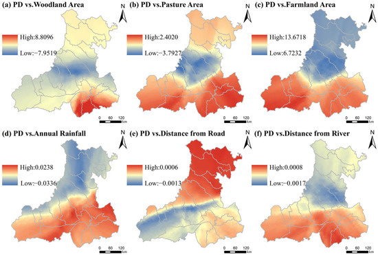 The spatially variable relationships between settlement spatial patterns and the most significant influencing factors were further explored using a GWR model. Prior to the GWR analysis, an ordinary least squares (OLS) regression was conducted (Table 3). Only variables with statistical significance at the p < 0.01 level were retained. In Figure 8, the spatial distribution of GWR coefficients between some representative factors with higher correlation coefficients was selected from all of the results for display.