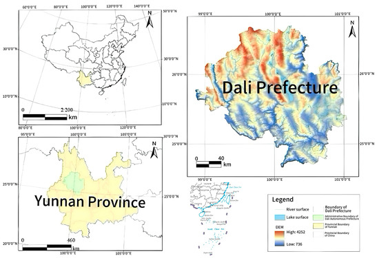 Dali Prefecture borders Chuxiong Prefecture to the east, Pu’er City and Lincang City to the south, Baoshan City and Nujiang Prefecture to the west, and Lijiang City to the north. As a strategic corridor in Yunnan Province for northward access to Sichuan and Tibet and southward connectivity to Myanmar’s maritime outlets, it occupies a pivotal position in Yunnan’s international transportation network linking Southeast and South Asia. Concurrently, Dali serves as the prefecture with the most advanced transportation infrastructure in western Yunnan and functions as a regional economic and logistical hub. The substantial passenger flow, cargo flow, and information exchange generated by its connectivity endow it with extensive transportation influence across Southwest China, Southeast Asia, and South Asia, solidifying its status as a strategic stronghold in China’s southwestern frontier and a critical transportation nexus in western Yunnan. The geographic context of the study area is illustrated in Figure 1.