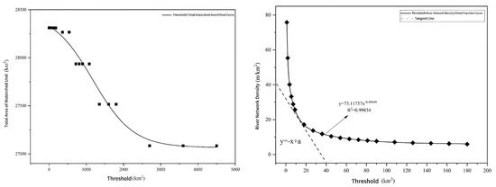 Depression filling was applied to the Digital Elevation Model (DEM) prior to a flow direction analysis to mitigate computational errors in subsequent hydrological processes. The flow direction analysis was conducted on the depression-free DEM using the D8 algorithm (eight-direction pour point method), which determines flow paths based on the maximum slope descent. The flow accumulation analysis assumes that each raster cell conveys a unit of water flow, calculating the Number of Inflow Paths (NIP) for each cell based on topographic gradients (i.e., flow from higher to lower elevations). Cells with elevated NIP values correspond to valley regions, whereas NIP = 0 indicates watershed divides. Surface runoff initiation is defined by a user-specified threshold (Y), where stream networks are extracted under the condition NIP > Y. This threshold critically governs the spatial accuracy of watershed boundary delineation. Sub-basin delineation involved tracing all upstream cells contributing to valley cells within the flow accumulation matrix. Key natural hydrological parameters, including total drainage area, number of drainage units, stream network length, and drainage density, were quantified to characterize the watershed system.