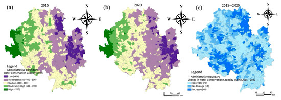 Figure 4. Spatial distribution and temporal changes of water conservation services at small-watershed scale in Dali Prefecture: (a) spatial distribution of water conservation capacity in 2015; (b) spatial distribution of water conservation capacity in 2020; (c) spatial variation of water conservation dynamics during 2015–2020.