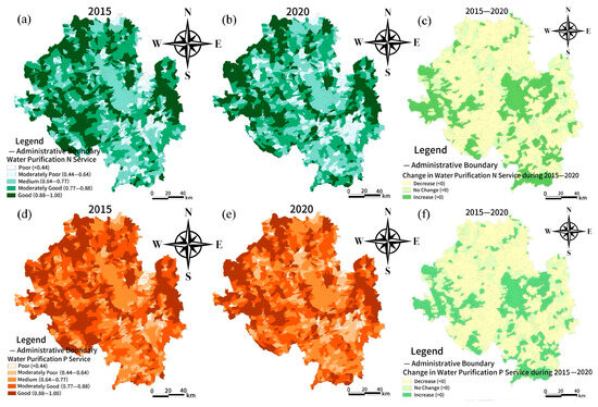 Figure 5. Spatial distribution and temporal dynamics of water purification services at small-watershed scale in Dali Prefecture: (a) spatial distribution of nitrogen (N) purification services in 2015; (b) spatial distribution of N purification services in 2020; (c) spatial dynamics of N purification services during 2015–2020; (d) spatial distribution of phosphorus (P) purification services in 2015; (e): spatial distribution of P purification services in 2020; (f): spatial dynamics of P purification services during 2015–2020.