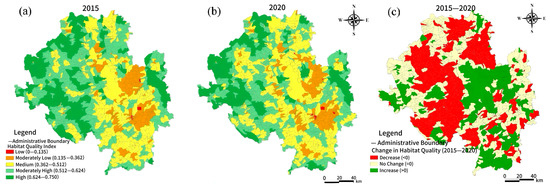 Figure 6. Spatial distribution and temporal dynamics of habitat quality services at small-watershed scale in Dali Prefecture: (a) spatial distribution of habitat quality services in 2015; (b) spatial distribution of habitat quality services in 2020; (c) spatial dynamics of habitat quality services during 2015–2020.