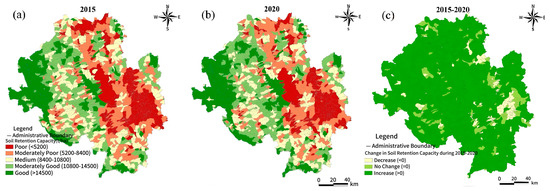 Figure 8. Spatial distribution and spatiotemporal dynamics of soil retention services at small-watershed scale in Dali Prefecture: (a) spatial distribution of soil retention services in 2015; (b) spatial distribution of soil retention services in 2020; (c) spatiotemporal dynamics of soil retention services during 2015–2020.