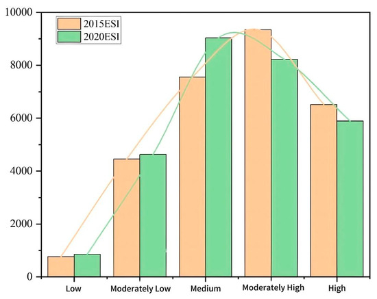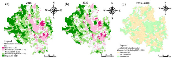 Figure 9. Spatial distribution and spatiotemporal dynamics of the Ecological Composite Index (ESI) at small-watershed scale in Dali Prefecture: (a) ESI spatial distribution in 2015; (b) ESI spatial distribution in 2020; (c) ESI spatiotemporal dynamics during 2015–2020.