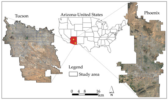 In this context, this study aims to evaluate the effects of landscape composition on LST values and SUHIs in arid desert cities at an optimal scale and to develop recommendations based on the findings. The cities of Phoenix and Tucson, which are located in the Sonoran Desert in the southwestern United States (US) and are arid desert cities in the state of Arizona, were determined as the study area. These cities are particularly relevant because, as noted by Shindell et al. [