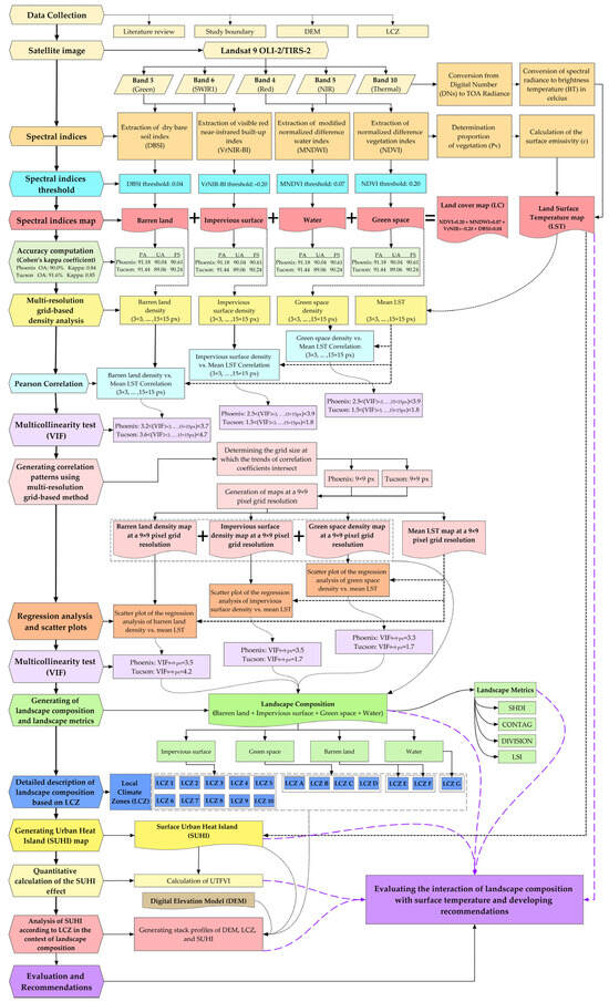 This study contributes to the literature by revealing the effects of urban landscape composition on LST and SUHI impact in arid desert cities. In this study, a multi-resolution grid-based analysis revealed that a spatial resolution of 9 × 9 pixels is optimal for assessing the impact of landscape composition on LST in arid desert cities such as Phoenix and Tucson. The landscape composition analysis showed that both cities have fragmented green spaces, along with complex landscape geometry and heterogeneous land cover distribution. However, the predominance of impervious surfaces in Phoenix and desert areas in Tucson clearly revealed differences in landscape composition between the cities. These compositional variations significantly affected the LST values observed in both cities. Moreover, the SUHI values calculated according to LCZs confirmed that landscape composition is a determining factor on surface temperatures. Overall, these results emphasize the importance of considering landscape composition and structure in climate-oriented spatial planning studies.