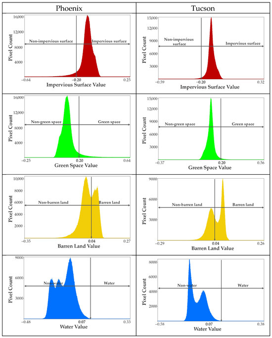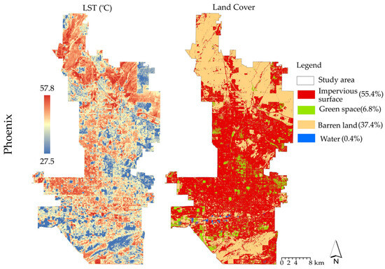 Table 3). In Phoenix, the most extensive land cover is impervious surfaces, accounting for 55.4% of the total area, followed by barren land (37.4%), green space (6.8%), and water surfaces (0.4%). In contrast, barren land constitutes the widest land cover type in Tucson, comprising 54.8% of the area, followed by impervious surfaces (42.1%), green space (2.9%), and water surfaces (0.2%) (