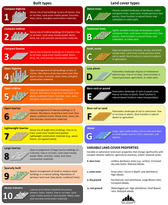 39] to assess thermal differences in urban areas in more detail and to calculate LST and SUHI events in standardized classified areas. The LCZ classification system categorizes cities into 17 different types based on physical characteristics such as building density, building height, and land cover. The first 10 types include built types (e.g., compact mid-rise, open low-rise, and sparsely built) and 7 types include land types (e.g., scattered trees, low plants, bare soil, or sand) [