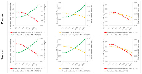 The relationship between mean LST and impervious surface, green space, and barren land at different grid sizes ranging from 3 × 3 to 15 × 15 pixels for the cities of Phoenix and Tucson was evaluated by a correlation analysis. All correlations across different grid sizes were statistically significant (