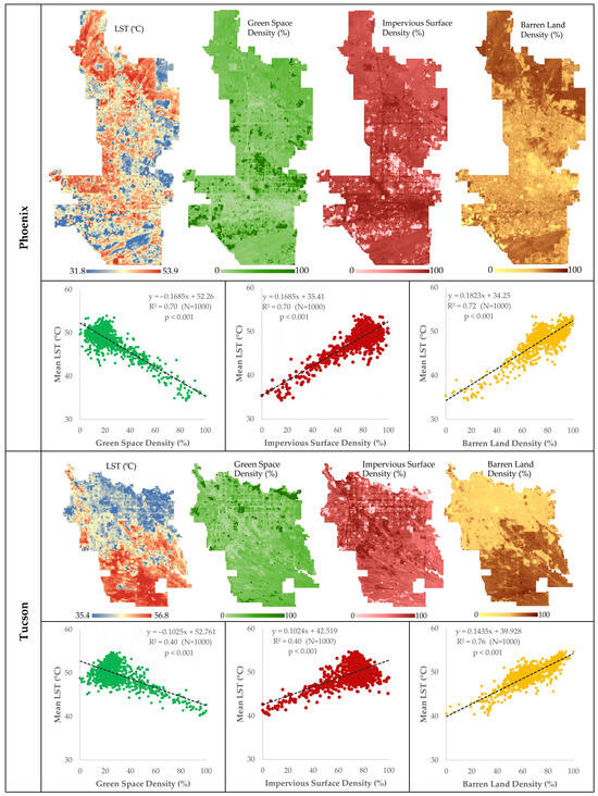 p < 0.001). In both cities, there was a consistently positive correlation between the densities of impervious surfaces and barren land, and the mean LST. However, the correlation between impervious surfaces and mean LST was stronger than that between barren land and mean LST. For both land cover types, the strength of the correlation showed a decreasing trend as grid size increased. In Phoenix, the correlation coefficient for impervious surfaces decreased from 0.86 to 0.74, whereas in Tucson, it declined more moderately, from 0.68 to 0.56. The correlation coefficient for barren land in Phoenix decreased slightly from 0.85 to 0.82, while in Tucson, it decreased from 0.89 to 0.83. The green space density exhibited a statistically significant negative correlation with LST in both cities. In Phoenix, the correlation coefficient increased from −0.74 to −0.87, while in Tucson, it ranged from −0.56 to −0.68 (