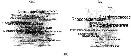 The co-occurrence networks of bacterial communities at each one of the treatment sites; ORG—organic; RA—regenerative agriculture; UC—control. Note: In this visualization, each node represents an OTU categorized by family, with connections between nodes indicating statistically significant correlations (p < 0.01). The size of each node corresponds to its degree of connectivity, highlighting the centrality of OTUs within the network.
