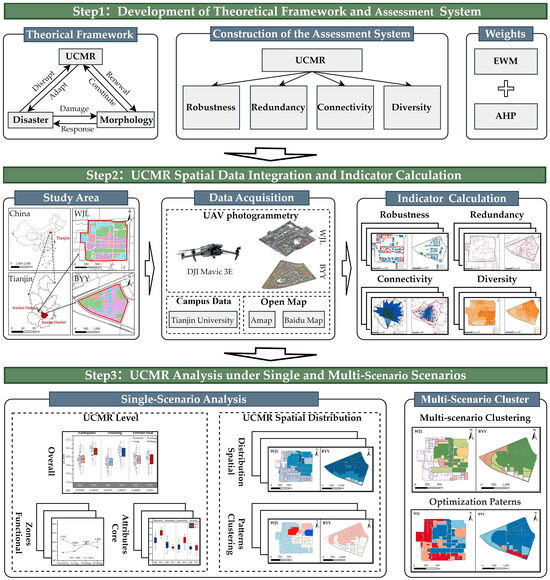 This study aims to fill these gaps by developing a theoretical framework for UCMR and proposing an evaluation system applicable to earthquake, flooding, and extreme-heat scenarios. The WJL and BYY campuses of Tianjin University have been selected as case study sites. The study aims to answer the following questions: