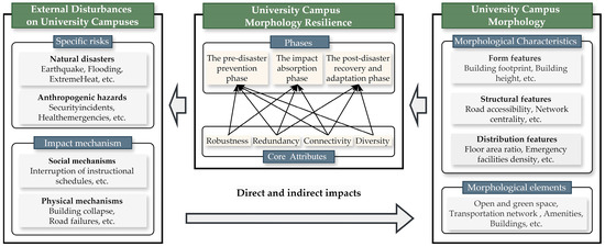 Walker [31] defines resilience as a system’s capacity to absorb disturbances and reorganize itself in the face of change. As Xie [20] suggests, through the lens of the original definition of resilience, studies on urban morphological resilience should focus on two key aspects: how external disturbances affect urban functions, and how morphological elements contribute to sustaining resilient regimes. Building on this perspective, this study specifically explores the interactions between disaster risk and campus morphology as a basis for constructing the theoretical framework of UCMR.