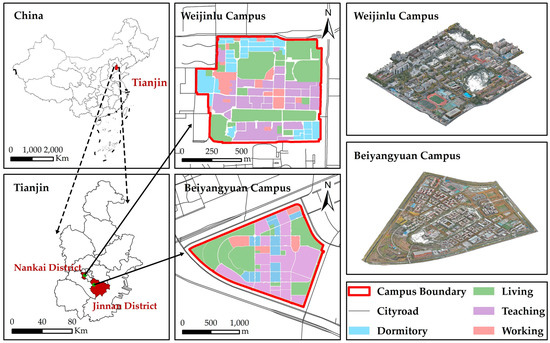 As case-study sites, this study examines the WJL and BYY campuses of Tianjin University—a prestigious “Project 9851” university [51] in China (Figure 3). Established in the 1950s, the WJL Campus is situated in the central Nankai District of Tianjin, occupying approximately 1.362 million square meters. The WJL Campus has an aging-built environment, with dispersed functional zones and a limited number of on-campus emergency facilities. However, it benefits from rich surrounding resources due to its location in the urban center. Established in 2015, the BYY Campus occupies approximately 2.436 million square meters in the suburban Jinnan District in southern Tianjin. The BYY Campus, marked by a modern built environment and spatially consolidated functional zones, offers a high density of internal facilities but lacks access to sufficient external resources in its suburban context.