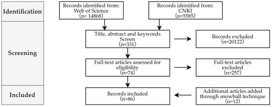 This study employed a systematic literature review and indicator selection approach, performing an extensive literature search in the Web of Science and China National Knowledge Infrastructure (CNKI) databases. Search strings incorporated thematically clustered terms related to earthquakes, flooding, extreme-heat events, campus form, and morphological resilience, as detailed in Table A1 of Appendix A, with a publication period spanning from 2015 to 2025. An initial filtering stage focused on titles, abstracts, and keywords, identifying 331 potentially relevant peer-reviewed sources. Then, through a full-text review, studies unrelated to natural disaster resilience, such as those focused on public safety, healthcare, or mental stress, were excluded, resulting in a final dataset of 74 publications. Furthermore, reference tracing through a snowballing technique led to the inclusion of an additional 12 records in the review database. Ultimately, 86 articles served as the foundation for the literature review and indicator selection (Figure 4).
