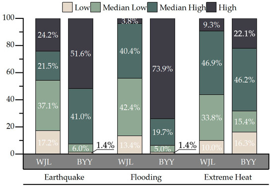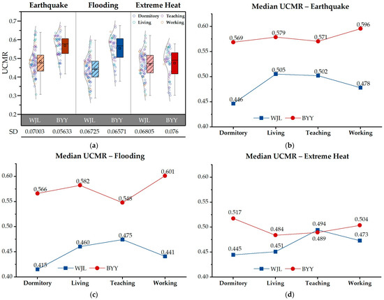 Figure 5b–d further reveal differences in functional-zone UCMR between the two campuses. At WJL Campus, the relative rankings of functional zones remained unchanged. The dormitory zone consistently recorded the lowest UCMR values across all disaster scenarios. The living zone had the highest UCMR in earthquake events, while the teaching zone had the highest ranking in flooding and extreme-heat events. At BYY Campus, rankings underwent significant changes. The dormitory zone had the lowest UCMR in earthquake events but the highest in extreme-heat events. The teaching zone recorded the lowest UCMR in flooding events. The living zone had the lowest UCMR in extreme heat, while the working zone ranked highest in earthquakes and flooding events.