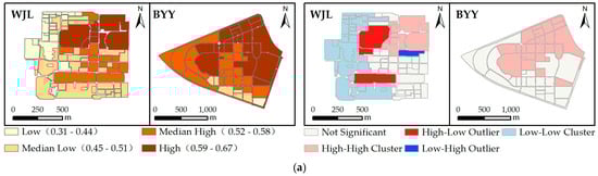 Under extreme-heat conditions, the WJL Road Campus demonstrated a moderately high overall UCMR level. Median-High (0.48–0.53) and High (0.54–0.62) units covered 56.2% of the area, clustering predominantly within the campus’s central and northern regions. Low (0.30–0.39) and Median-Low (0.40–0.47) units were mainly located along the campus’s southern, northwestern, and northeastern edges. High-High clusters were concentrated in the northeast region, Low-Low clusters emerged in the west, and sporadic High-Low outliers appeared along cluster boundaries. The BYY Campus showed higher UCMR levels. Median-High and High units, covering 68% of the area, were clustered in the central and northeastern regions. Low and Median-Low units were mainly along the western and southern margins. The northern part of the campus displayed High–High clusters, while Low–Low clusters prevailed in the south. Some transitional zones also revealed sporadic High–Low outliers.