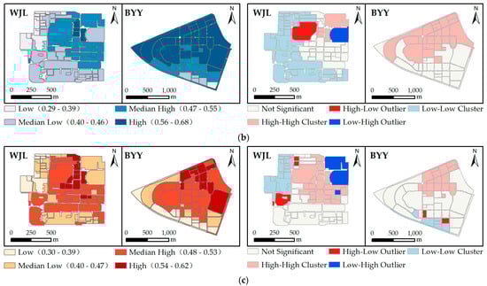 UCMR distributions and spatial clustering patterns for the WJL and the BYY campus: (a) under earthquake conditions; (b) under flooding conditions; (c) under extreme-heat conditions.