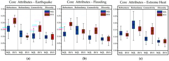 Core UCMR attributes of the two campuses under three disaster conditions: (a) under earthquake conditions; (b) under flooding conditions; (c) under extreme-heat conditions.